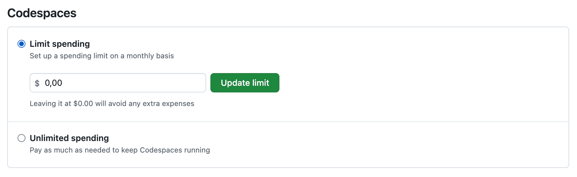 3. Set a budget or limitation on Codespace usage to prevent unexpected fees. Leaving it at $0.00 will avoid any extra expenses.